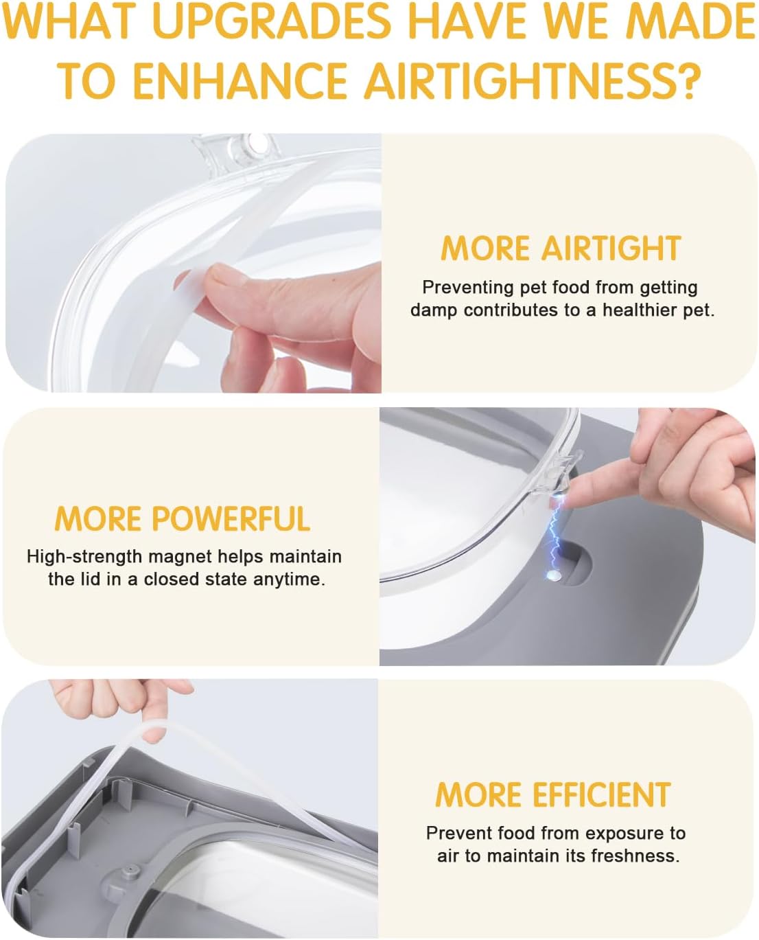 • MOISTURE-PROOF: Airtight dog food storage container, the bottom slightly elevated design allows the dry food away from wet ground to ensure that the pet fresh food is available.(Tips:when you close the small dog food containers' transparent lid, please make sure it is completely closed with no space)