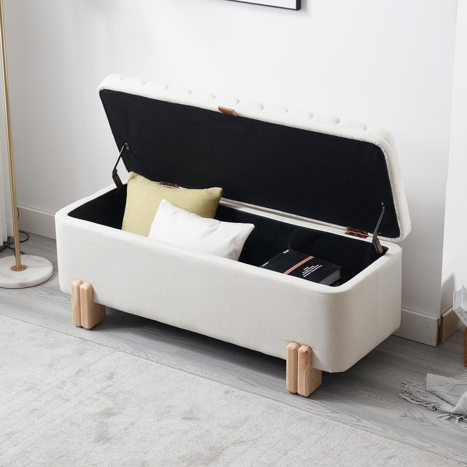 - [EASY ASSEMBLE] Easy to assemble, only need to assemble 4 wooden legs, 10 minutes to complete the assembly. Safety hinges can give you the best support when you use the storage function.