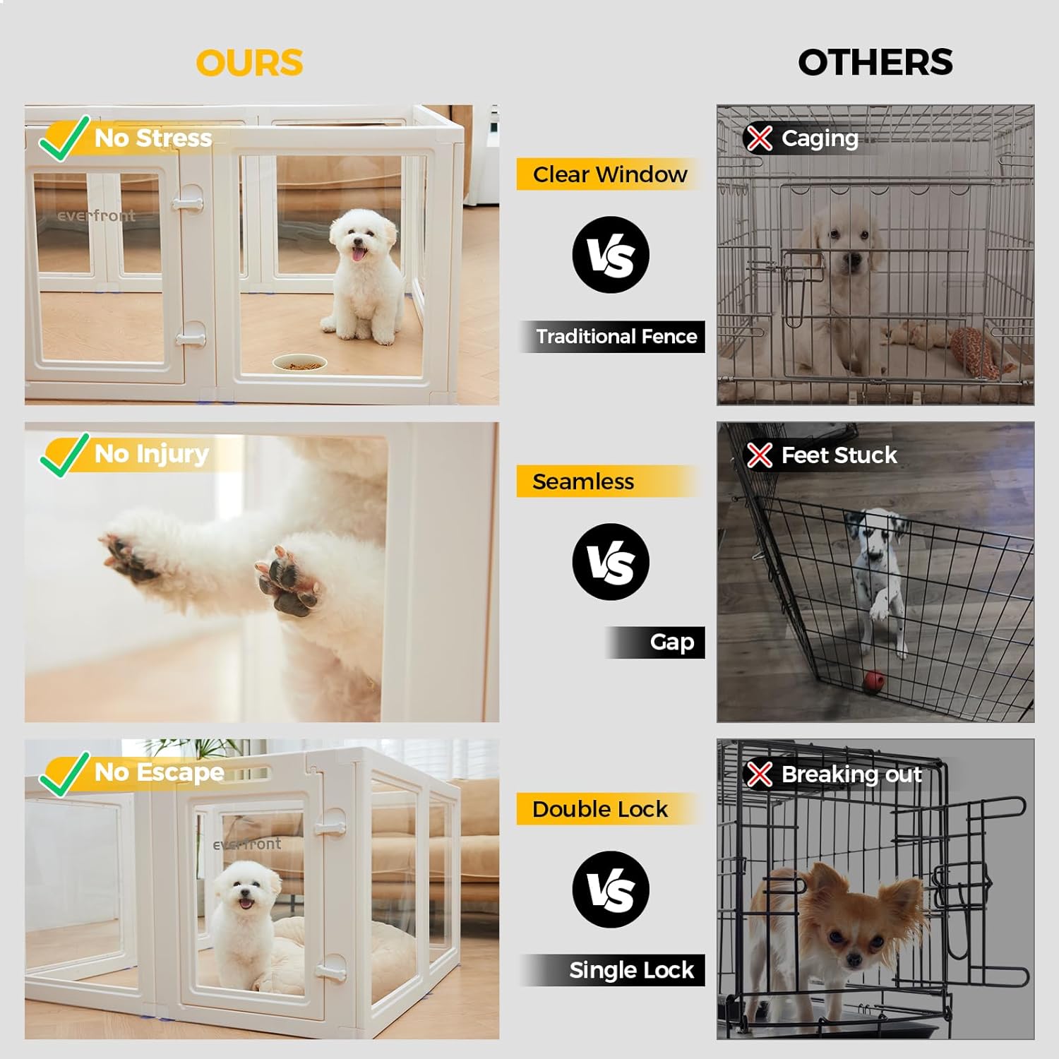 - Clear View, Less Stress - Everfront clear acrylic plastic dog playpen adopts all-new clear view design by using transparent acrylic panels, which allows you to observe your pet at all times, and significantly reduces stress of pet comparing to dog fence type kennel as if being caged.