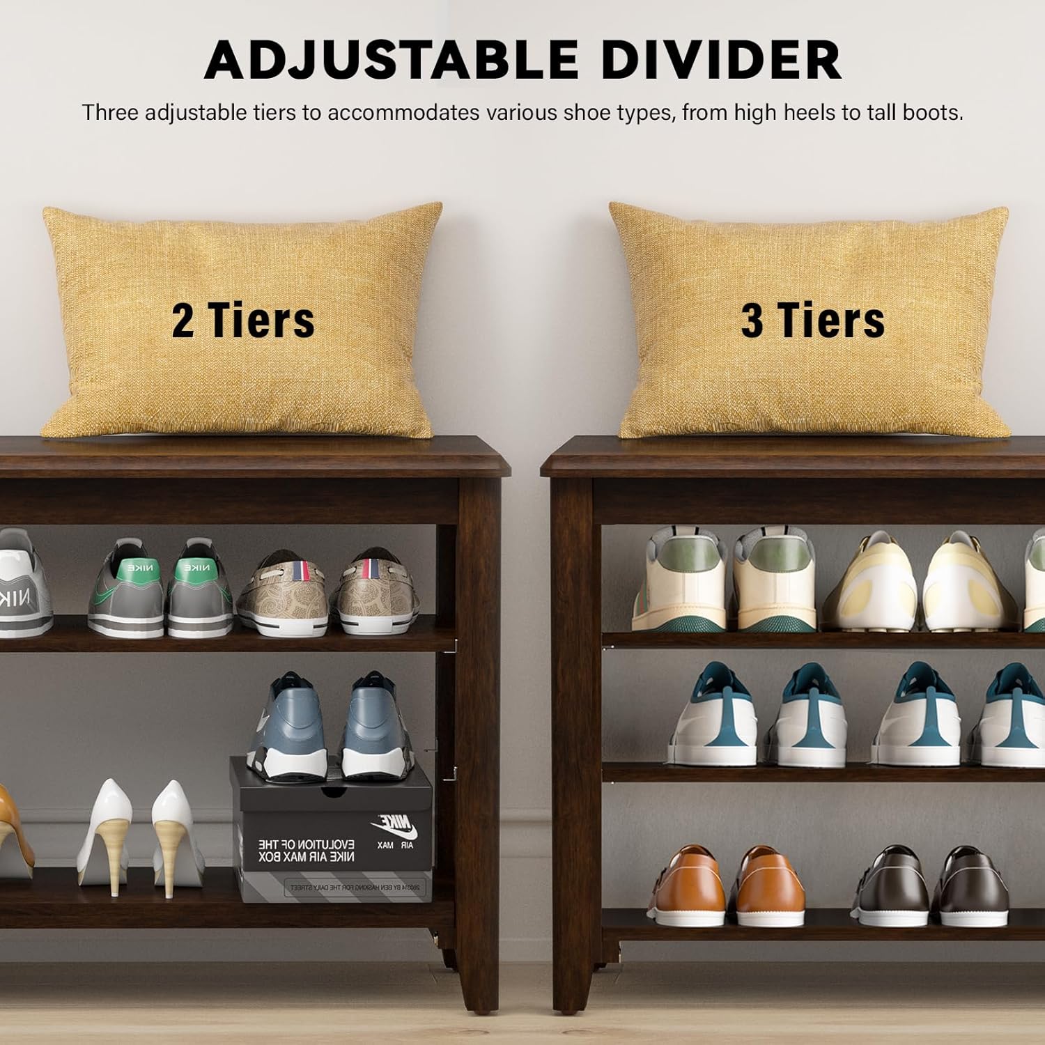 - Customizable Storage: With three adjustable tiers that can be raised or lowered by 1.18 inches, this shoe bench accommodates various shoe types, from high heels to tall boots. Easily modify the shelf heights to fit your footwear needs, allowing you to maintain an organized and clutter-free entryway