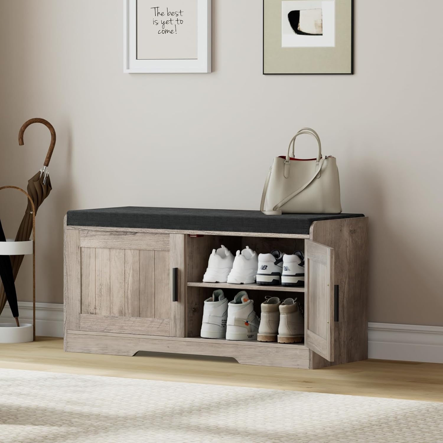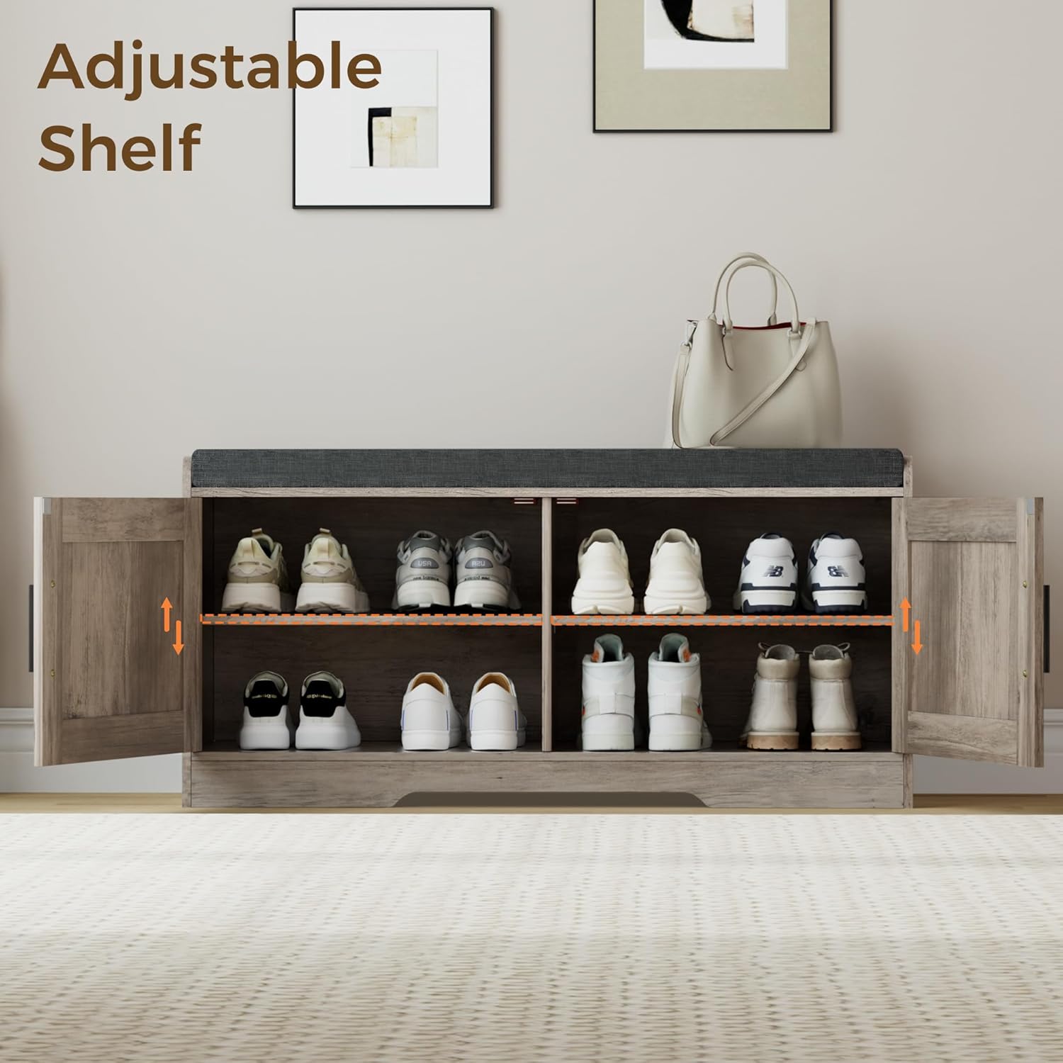 2-Tier Storage Bench, Shoe Bench with Thickened Padded Seat Cushion, Entryway Bench with 2 Doors, Adjustable Shelf, 13.8" D x 37.4" W x 18.5" H, for Entryway, Living Room, Bedroom, Greige