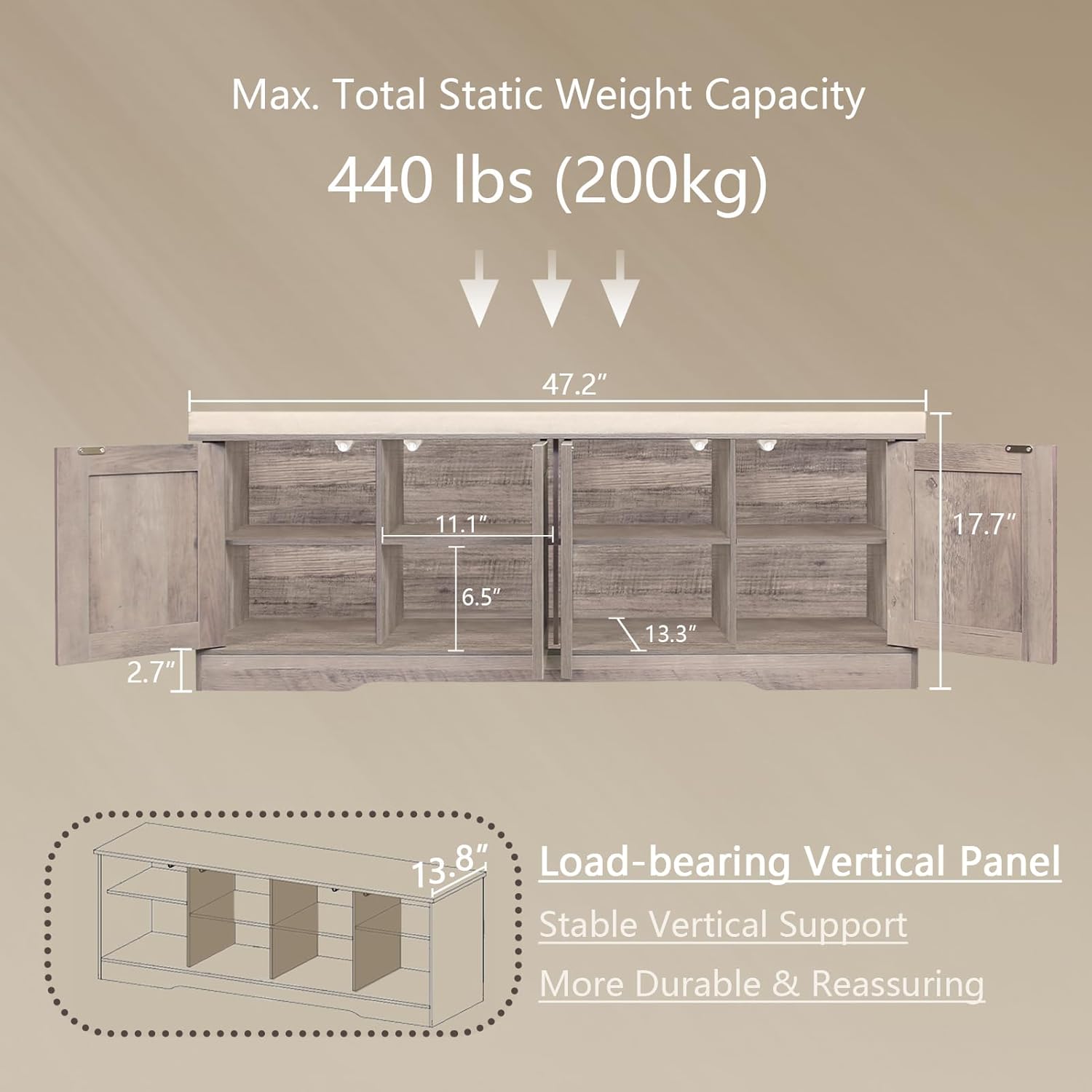 DINZI LVJ Shoe Bench, Entryway Storage Bench with Doors, Cushion, 2-Tier Shoe Rack with 8-Cubby, 47.2”L x 13.8”W Shoe Organizer Cabinet, Adjustable Shelf, Living Room, Bedroom, Greige