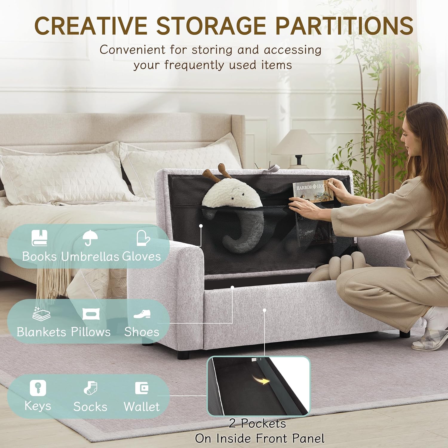 - ๐๐ง๐ญ๐๐ซ ๐ ๐ซ๐จ๐ง๐ญ ๐๐จ๐๐ค๐๐ญ ๐๐จ๐ซ ๐๐๐ฌ๐ฒ ๐๐๐๐๐ฌ๐ฌ ๐ญ๐จ ๐๐ฌ๐ฌ๐๐ง๐ญ๐ข๐๐ฅ๐ฌ-Our storage bench has a larger capacity of 37 gallons, allowing you to store more items. In addition, it features creative and thoughtful designs that take everyday usability in mind. Inside the front panel, youโll find 2 pocketsโperfect for stashing items you need often, like socks, remote controls, keys, or earbuds. No need to dig through everything to grab what you use most.